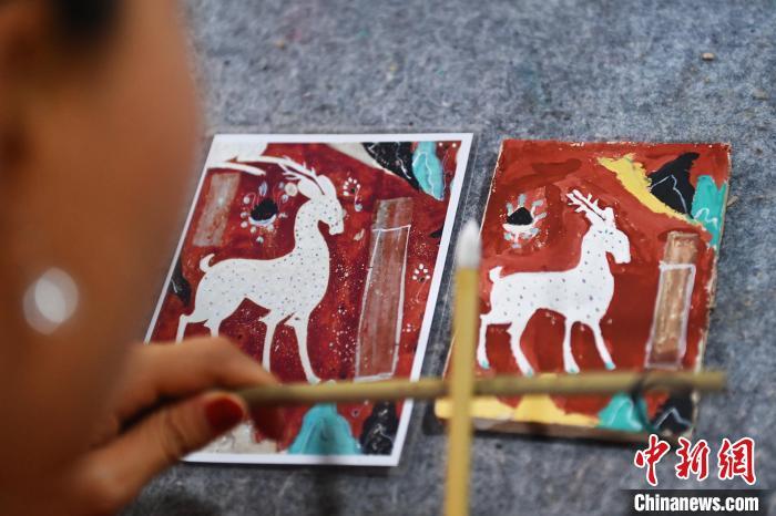 8月20日,甘肅敦煌莫高里工匠村內(nèi),學(xué)員展示研學(xué)成果。工匠村開設(shè)了泥板畫、彩繪、雕塑制作、剪紙、農(nóng)耕體驗(yàn)等課程,現(xiàn)已發(fā)展成為一個(gè)集敦煌文化講堂、壁畫書法研習(xí)、美術(shù)設(shè)計(jì)、彩塑制作教學(xué)、篆刻藝術(shù)、傳統(tǒng)釀酒體驗(yàn)、農(nóng)業(yè)產(chǎn)業(yè)發(fā)展等于一體的多功能實(shí)訓(xùn)基地。中新社記者 李亞龍 攝