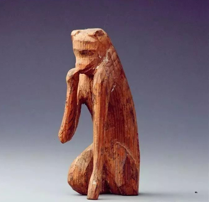 木猴,東漢,1957年甘肅武威磨嘴子出土。此猴跪坐,頭微低,左前肢垂直撐地,右前肢伸至嘴部,似在抿嘴偷笑,又似在品嘗食物。整個(gè)雕塑用黑、紅兩色彩繪,形體小巧,刀法簡(jiǎn)練,將一只調(diào)皮的猴子微感惶惑的瞬間神態(tài)刻畫入微。該作品用一塊木頭雕成,是漢代雕刻中的佳作。