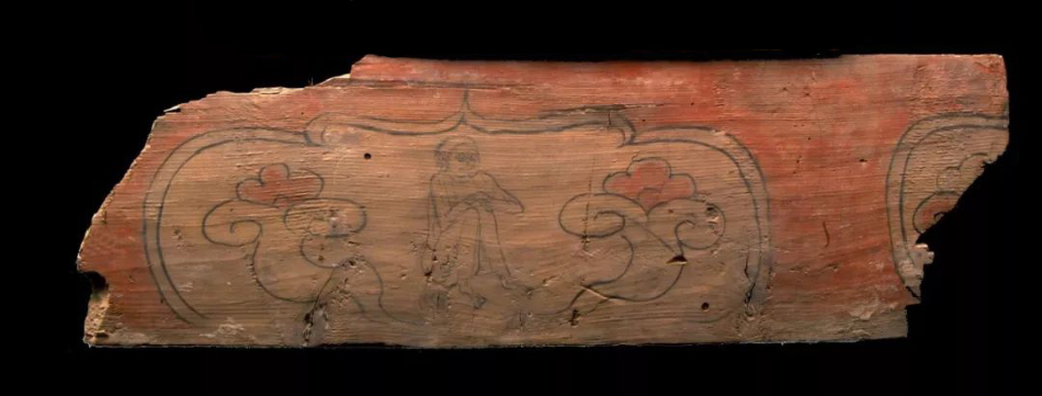 彩繪“猴”生肖木版畫,唐代,一級(jí)文物。1979年肅南縣大長嶺唐墓出土。木版畫長73厘米,寬22厘米,猴生肖木版畫呈長方形,墨筆雙線勾勒一壸門開光。壸門內(nèi)墨線勾勒一猴,其雙手環(huán)抱膝蓋至胸前,猴身兩側(cè)繪有兩朵升騰祥云。壸門外飾以土紅色。
