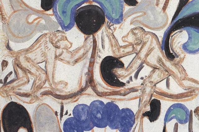 在這一壁畫中共畫了五只猴子,其中有兩只猴子在有摩尼寶珠的蓮花下面玩耍,猴子尾巴高高翹起,尖嘴大臉,似乎在用手攀折蓮枝,畫面構(gòu)圖簡(jiǎn)練生動(dòng)。