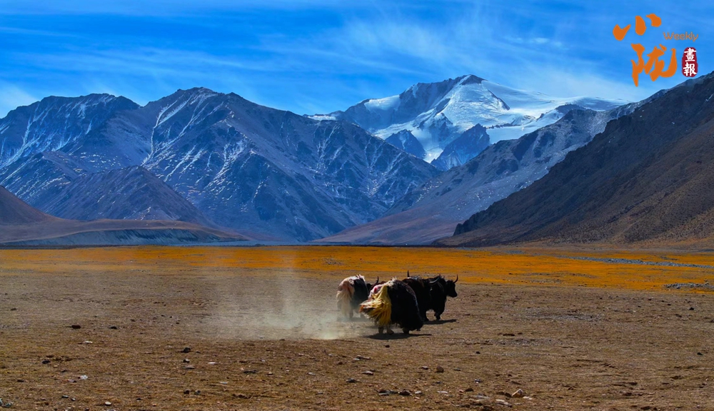 初秋,草香撲面而來,綠草漸被秋風(fēng)染黃,與雪山、藍(lán)天繪成一幅層次鮮明的風(fēng)景畫。