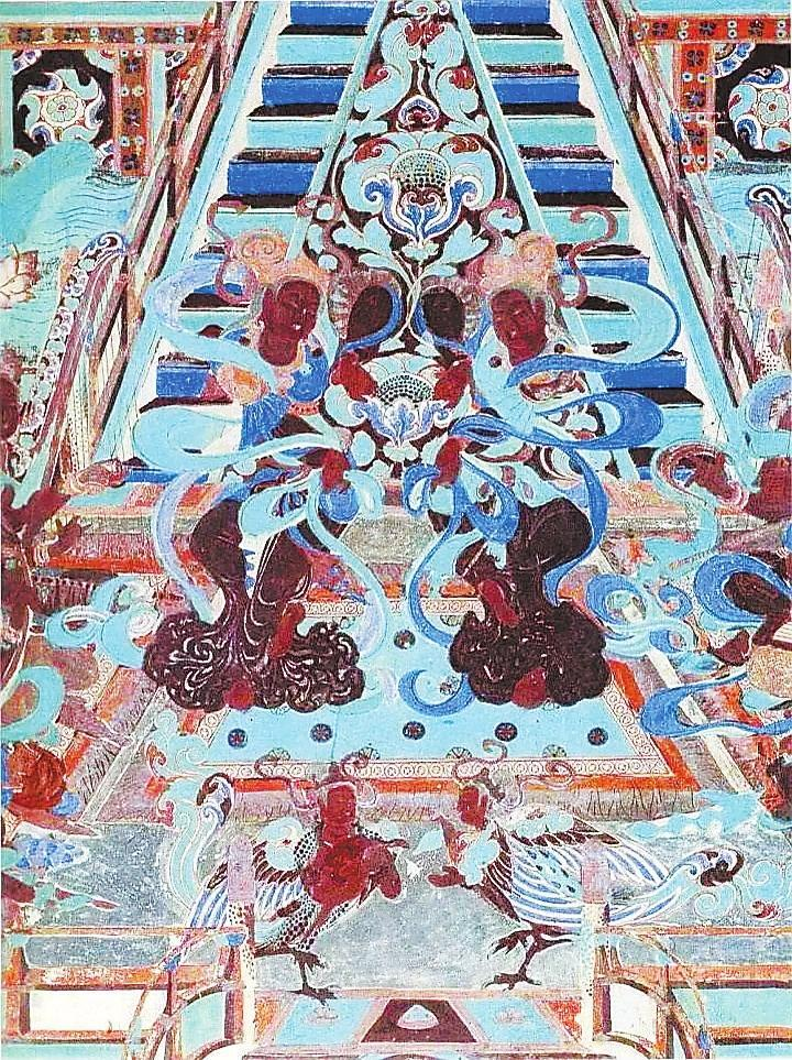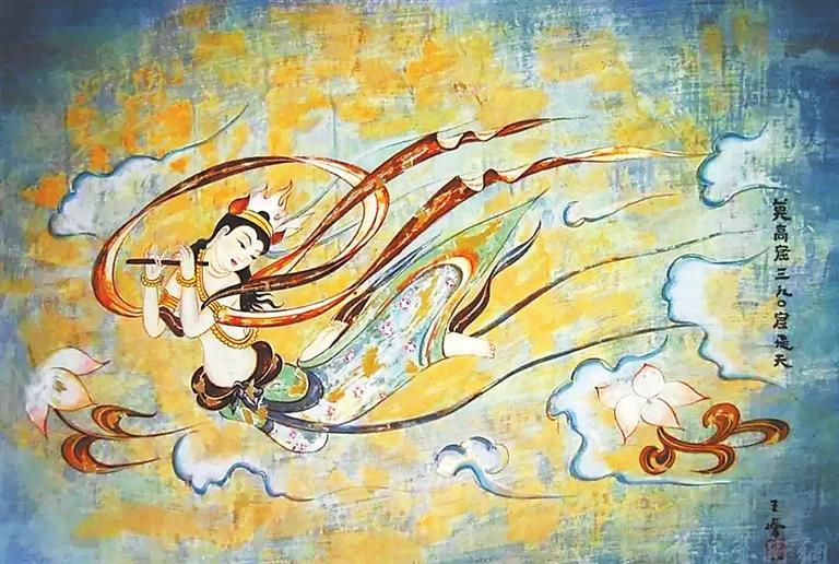 敦煌莫高窟,窟窟有壁畫,拼接起來長達(dá)45000多平方米,有世界上“最大畫廊”之稱。這些壁畫中,幾乎每幅都有舞蹈形象,如在窟頂、龕楣、藻井遨游的飛天,憑欄上的天宮伎樂,經(jīng)變畫中的娛佛、敬佛的獻(xiàn)舞者——伎樂天,出行圖中跳著具有濃郁生活氣息的世俗樂舞,以及富有舞蹈美感的彩塑菩薩、天王力士等,琳瑯滿目,精妙絕倫。這些舞蹈形象充分反映了從十六國北朝至元代千余年來不同歷史時期的舞蹈服飾、形態(tài)、風(fēng)貌,為我們挖掘、整理、弘揚中華民族舞蹈文化提供了十分珍貴的形象資料。