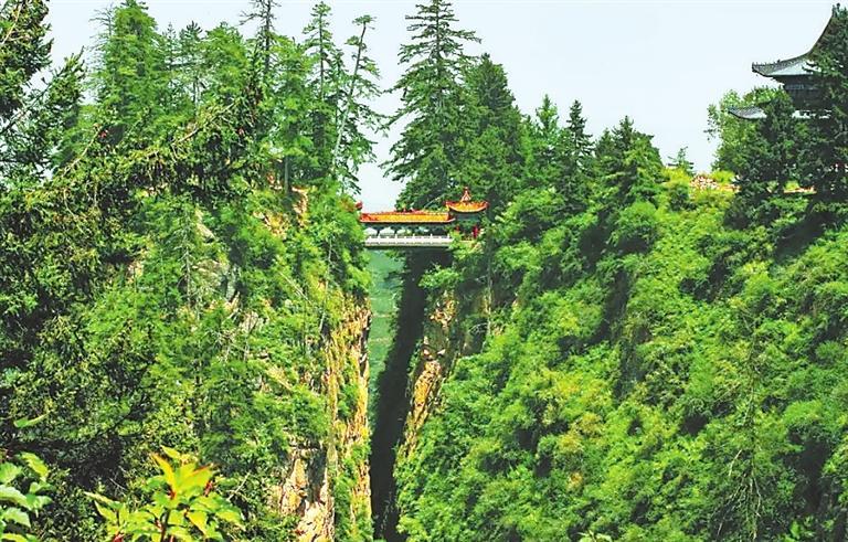 其實,石門山系小隴山林區(qū)的余脈,蘊(yùn)藏著得天獨(dú)厚的植物資源,有我國南北的各種野生植物百余種,其中有很多還是園林中的珍品。據(jù)景區(qū)資料得知,石門山由北峰、麒麟峰、南峰構(gòu)成。北峰建有無量殿、靈官殿、文昌宮、三清殿、鐘樓。麒麟峰建有圣母宮、三肖殿、三仙庵。南峰峰頂建有玉皇閣和三官殿。這些殿宇大多為明清重修,依山就勢,錯落有致,風(fēng)格纖巧,玲瓏俊秀,最小的殿宇僅有5至6平方米,在石門山的萬綠叢中時隱時現(xiàn),猶如一幅濃淡相宜,層次分明的水墨畫,形成了石門山特有的風(fēng)韻。