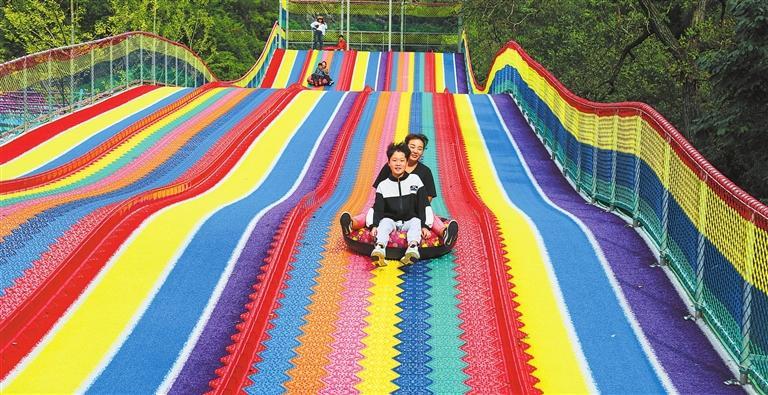 10月2日,游客在隴南市武都區(qū)五馬“網紅”童話小鎮(zhèn)體驗彩虹滑道。新甘肅·甘肅日報通訊員 李旭春