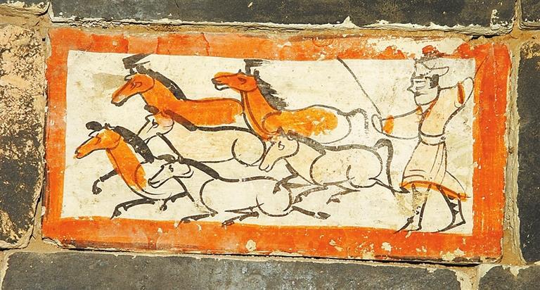 魏晉十六國磚畫在墓中的布局、組合,體現(xiàn)出 “滿”和“層”的特點(diǎn)。整個(gè)墓室,各方位、各邊角以及過道均鑲砌畫磚。以嘉峪關(guān)果園—新城5號墓畫磚的布局為例,各層間隔、同層緊鄰的畫磚,給觀者的感覺就是整幅壁畫,但每一塊又是一個(gè)獨(dú)立的畫面,這種“樣式”,是魏晉十六國時(shí)期的河西匠工、畫工,在繼承漢晉磚室墓的同時(shí),將畫像磚在墓室布局的方式也加以接受。艷麗的色彩,“忠實(shí)”生活的寫實(shí)手法,又是河西畫匠們的創(chuàng)新和發(fā)揮。