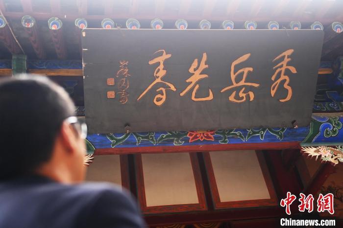 10月23日,甘肅省天水市秦安縣鳳山景區(qū),講解員介紹魯岱下人許行所題隸書“秀岳先春”的匾額。匾額文化是中華民族獨特的民俗文化,它把辭賦詩文、書法篆刻、建筑藝術融為一體。秦安作為歷史文化名城,其不少景區(qū)內都存在歷史名人所題珍貴匾額,見證了歷史變遷。中新社記者 李亞龍 攝