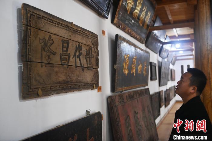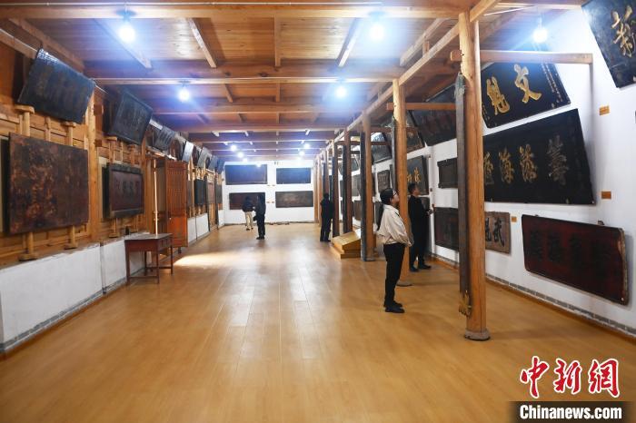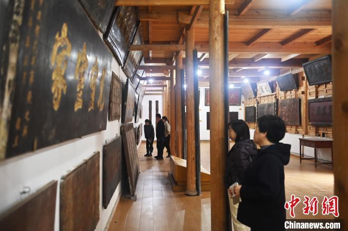 10月23日,甘肅省天水市秦安縣明清街秦安匾額博物館,游人參觀當?shù)厥詹氐呢翌~。中新社記者 李亞龍 攝