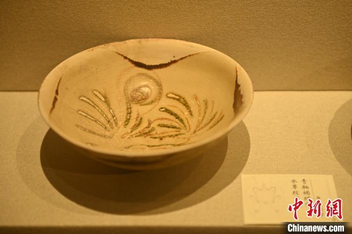 10月27日,在甘肅省博物館內展陳的青釉褐綠彩水草紋瓷碗。中新社記者 李亞龍 攝