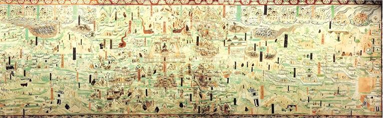 莫高窟61窟,建于五代晚期,是河西歸義軍節(jié)度使曹元忠及夫人開鑿的功德窟,又稱“文殊堂”,主要為供奉文殊菩薩而修。該窟的亮點(diǎn)是西壁的巨幅五臺(tái)山圖。這是敦煌壁畫中規(guī)模最大的山水人物圖,也是全景式歷史地圖。五臺(tái)山圖長(zhǎng)13.6米,高3.5米,畫中詳細(xì)描繪了東起河北正定,西至山西太原,方圓五百里的山川地形及社會(huì)風(fēng)情,再現(xiàn)了五代時(shí)期五臺(tái)山佛國圣境的氛圍。