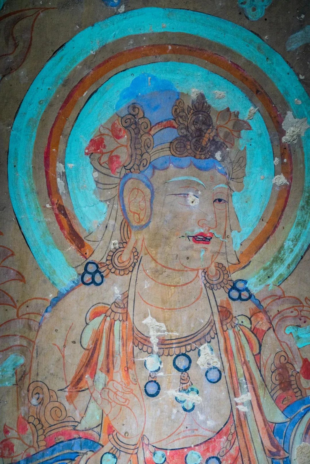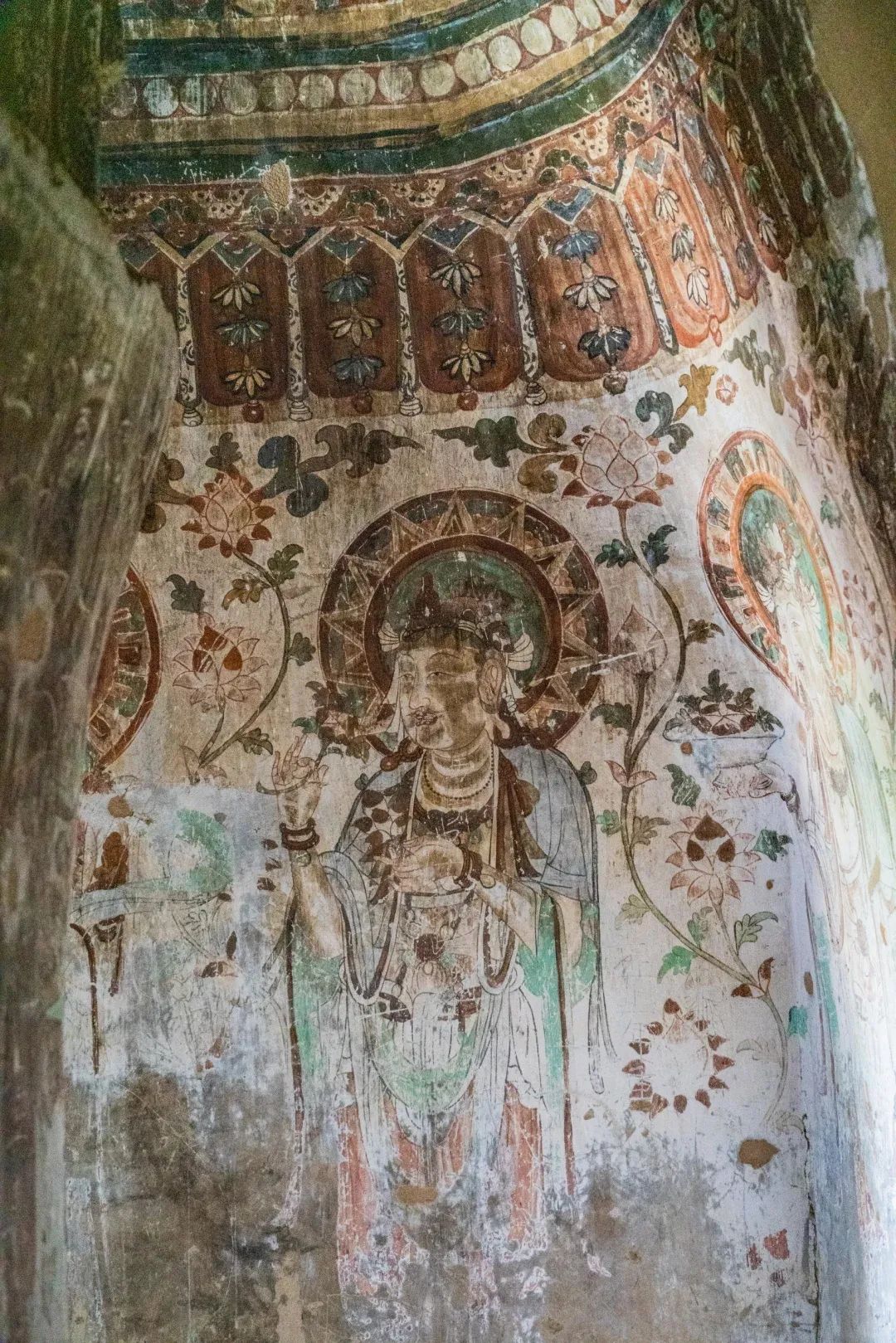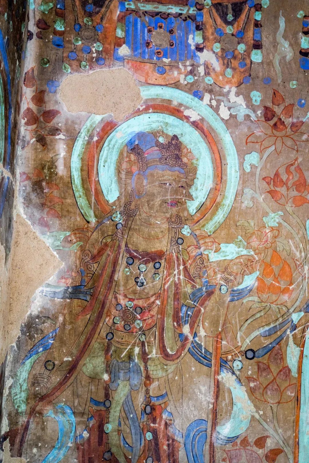現(xiàn)在第4窟中早期塑像多數(shù)已毀,但仍殘存少數(shù)幾身,十分珍貴;各側(cè)面表層為西夏重修時(shí)繪制的壁畫;柱座與柱身的兩層自下而上逐層縮??;中心柱正面在西夏時(shí)改造成一橢圓形的大背屏,背屏正面表層為清代重繪的壁畫;四壁及頂上壁畫也多為西夏時(shí)期。