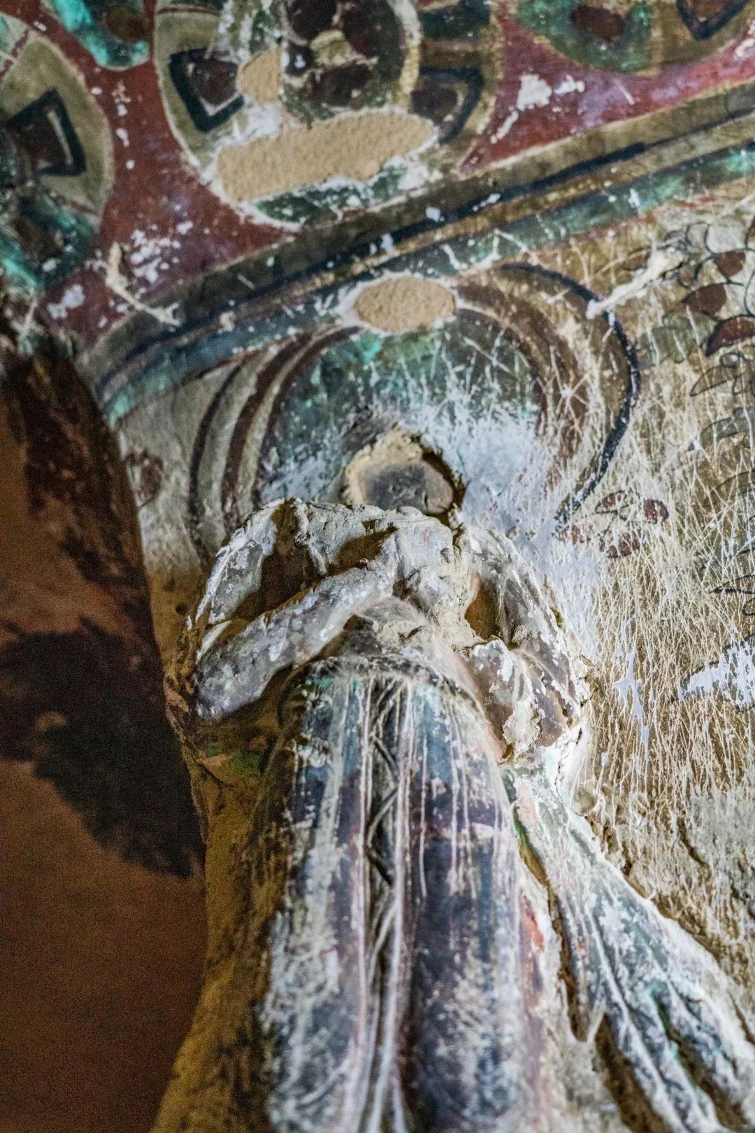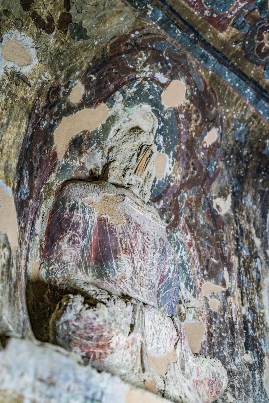塑像題材為簡(jiǎn)單的一佛二菩薩。內(nèi)塑一坐佛像,龕外兩側(cè)各塑一脅侍菩薩像,上層開—淺龕,中間塑一結(jié)跏趺坐佛像,面相渾圓,雙手?jǐn)n于袈裟內(nèi),衣角垂于腹前,陰線刻衣紋。頭部均毀,露出麥草扎成的骨干。龕外兩側(cè)各塑一脅侍菩薩像,雙手合十,佩項(xiàng)圈、瓔珞,披帛搭于肩上,帛帶下垂外張。佛與菩薩,作風(fēng)古樸,技法概括而又簡(jiǎn)練,很接近敦煌莫高窟259窟,其時(shí)代可能為北涼時(shí)期。