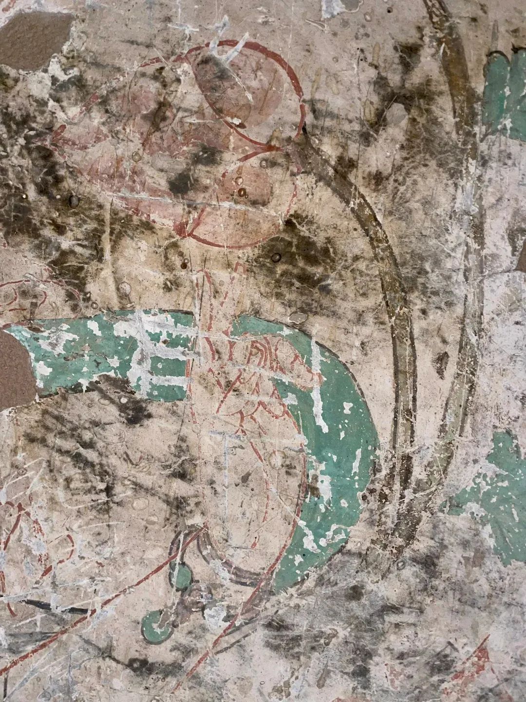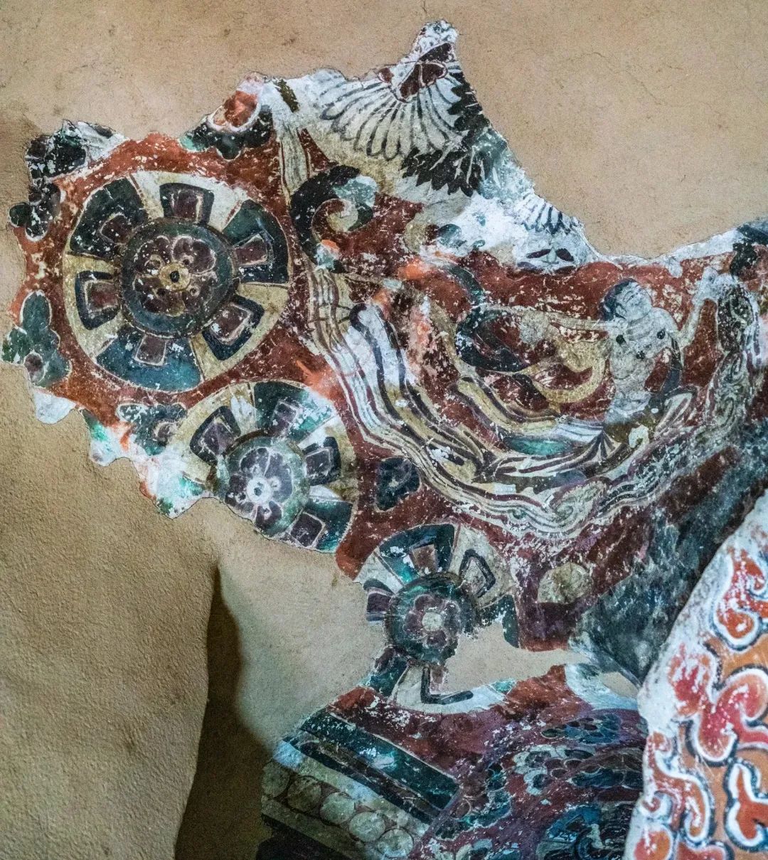 昌馬石窟第4窟洞窟形制及其殘存的塑像對(duì)于研究中國早期石窟藝術(shù)與佛教造像藝術(shù)極其重要??邇?nèi)壁畫內(nèi)容是四壁上方畫條式旌幡,下畫供養(yǎng)菩薩,身高近2米,今殘存20身,菩薩周圍畫纏枝蓮,與第二窟基本相同??唔斍鞍氩康卣檀蟛糠置撀洌拷行闹嫔喜坑覀?cè)的部位殘存龜形六瓣團(tuán)花圖案與一身飛天及菊花紋圖案。后部中心柱頂部周圍窟頂表面繪龜形六瓣團(tuán)花、連珠紋等圖案。