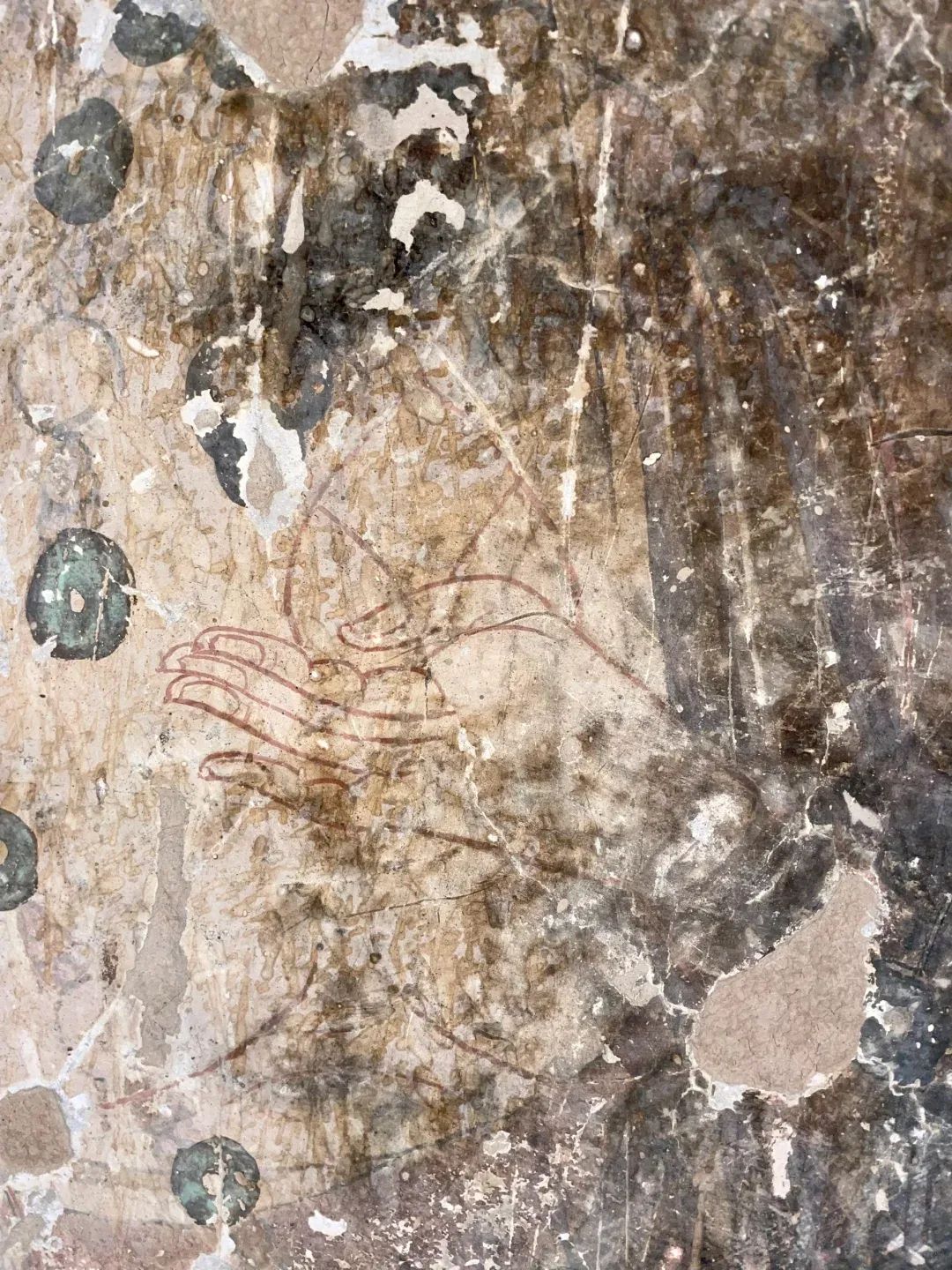昌馬石窟所在的玉門地區(qū)是古代絲綢之路的必經(jīng)之地,也是佛教?hào)|傳的必經(jīng)之地。早期從印度或西域傳來的佛教造像風(fēng)格在昌馬石窟中也有所反映。第4窟中心柱上層的坐佛塑像采用的在胸前及手臂表面呈連續(xù)相疊的“U”字形下垂的陰線刻衣紋的形式,我們?cè)诙鼗湍呖叩?59窟與馬蹄寺石窟千佛洞第2窟等處的坐佛塑像身上都可以見到,這種貼體的袈裟表面陰刻規(guī)整衣紋的形式是受到印度笈多造像藝術(shù)影響的產(chǎn)物。