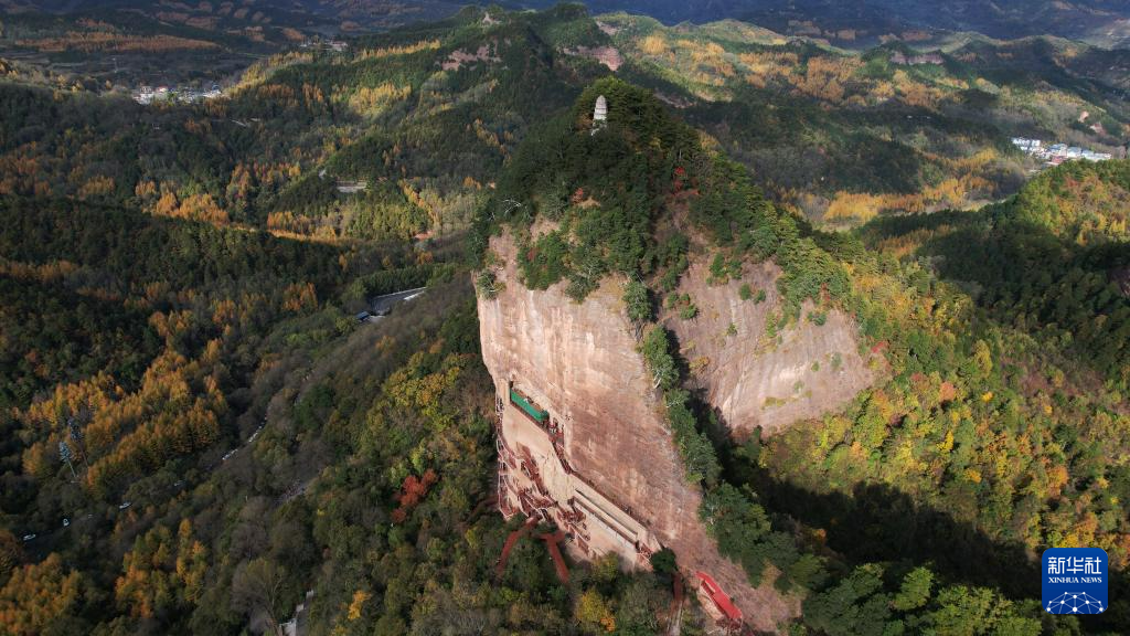 這是11月2日拍攝的麥積山石窟秋景(無人機(jī)照片)。新華社記者 郎兵兵 攝