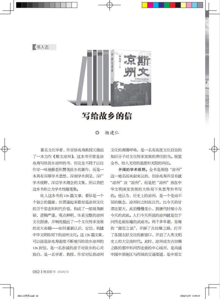 閱讀徐兆壽寫給故鄉(xiāng)的帶著滾燙體溫的126封信,總是給人一種澎湃的激情和磅礴的力量,總是讓人思接千載、視通萬里?!端刮臎鲋荨妨⒆憬z綢之路和中華文明的歷史格局,提出了重構(gòu)涼州文化的宏大愿望,讓讀者深刻認(rèn)識到,徐兆壽的故鄉(xiāng)涼州,不單單是他日夜眷戀的熱土,而是打破了行政區(qū)劃的大地理概念,更是中華民族共同的文化符號和精神歸宿。在建設(shè)中華民族現(xiàn)代文明的今天,我們應(yīng)當(dāng)全面了解、認(rèn)識、重構(gòu)涼州文化,真正做到創(chuàng)造性轉(zhuǎn)化、創(chuàng)新性發(fā)展。認(rèn)識了這本書的價值,也就認(rèn)識了作者的價值,徐兆壽不僅是一位優(yōu)秀的文化學(xué)者、教授、作家,而且也是一位有智慧、有見地的歷史學(xué)家。