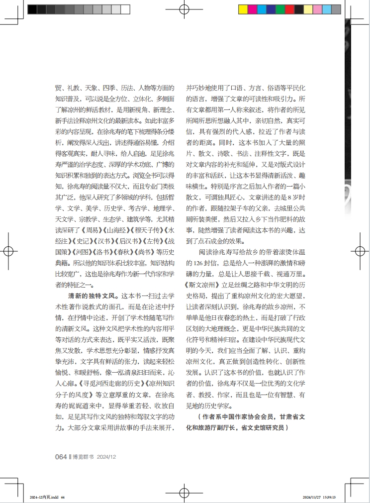 豐富的知識體系。這本學(xué)術(shù)性隨筆集,是徐兆壽近20年來教學(xué)、研究的成果體現(xiàn),不但學(xué)術(shù)性強、抒情性濃,而且知識面廣,既有歷史、政治、文化、藝術(shù)等方面的內(nèi)容解讀,又有民風(fēng)、民俗、家訓(xùn)、家教等方面的常識介紹,還有民居、服飾、飲食、農(nóng)耕、商貿(mào)、禮教、天象、四季、歷法、人物等方面的知識普及,可以說是全方位、立體化、多側(cè)面了解涼州的鮮活教材,是用新視角、新理念、新手法詮釋涼州文化的最新讀本。如此豐富多彩的內(nèi)容呈現(xiàn),在徐兆壽的筆下梳理得條分縷析,闡發(fā)得深入淺出,講述得通俗易懂,介紹得客觀真實,耐人尋味,給人啟迪,足見徐兆壽嚴(yán)謹(jǐn)?shù)闹螌W(xué)態(tài)度、深厚的學(xué)術(shù)功底、廣博的知識積累和獨到的表達(dá)方式。瀏覽全書可以得知,徐兆壽的閱讀量不僅大,而且專業(yè)門類極其廣泛,他深入研究了多領(lǐng)域的學(xué)科,包括哲學(xué)、文學(xué)、美學(xué)、歷史學(xué)、考古學(xué)、地理學(xué)、天文學(xué)、宗教學(xué)、生態(tài)學(xué)、建筑學(xué)等,尤其精讀深研了《周易》《山海經(jīng)》《穆天子傳》《水經(jīng)注》《史記》《漢書》《后漢書》《左傳》《戰(zhàn)國策》《河圖》《洛書》《春秋》《尚書》等歷史典籍。所以他的知識體系比較豐富,知識結(jié)構(gòu)比較寬廣,這也是徐兆壽作為新一代作家和學(xué)者的特征之一。