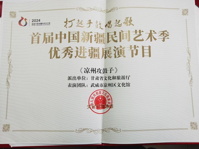 今年8月,文化和旅游部舉辦首屆中國新疆民間藝術(shù)季,《涼州攻鼓子》代表甘肅省參加首屆中國新疆民間藝術(shù)季群眾文化活動開幕式演出,并在烏魯木齊市、石河子市進(jìn)行了多場巡回展演,其獨特的表演風(fēng)格和深厚的文化內(nèi)涵,為觀眾呈現(xiàn)了一場又一場視聽盛宴,不僅展現(xiàn)了甘肅人民的英勇與豪邁,也讓更多人領(lǐng)略到了甘肅非遺文化的非凡魅力。