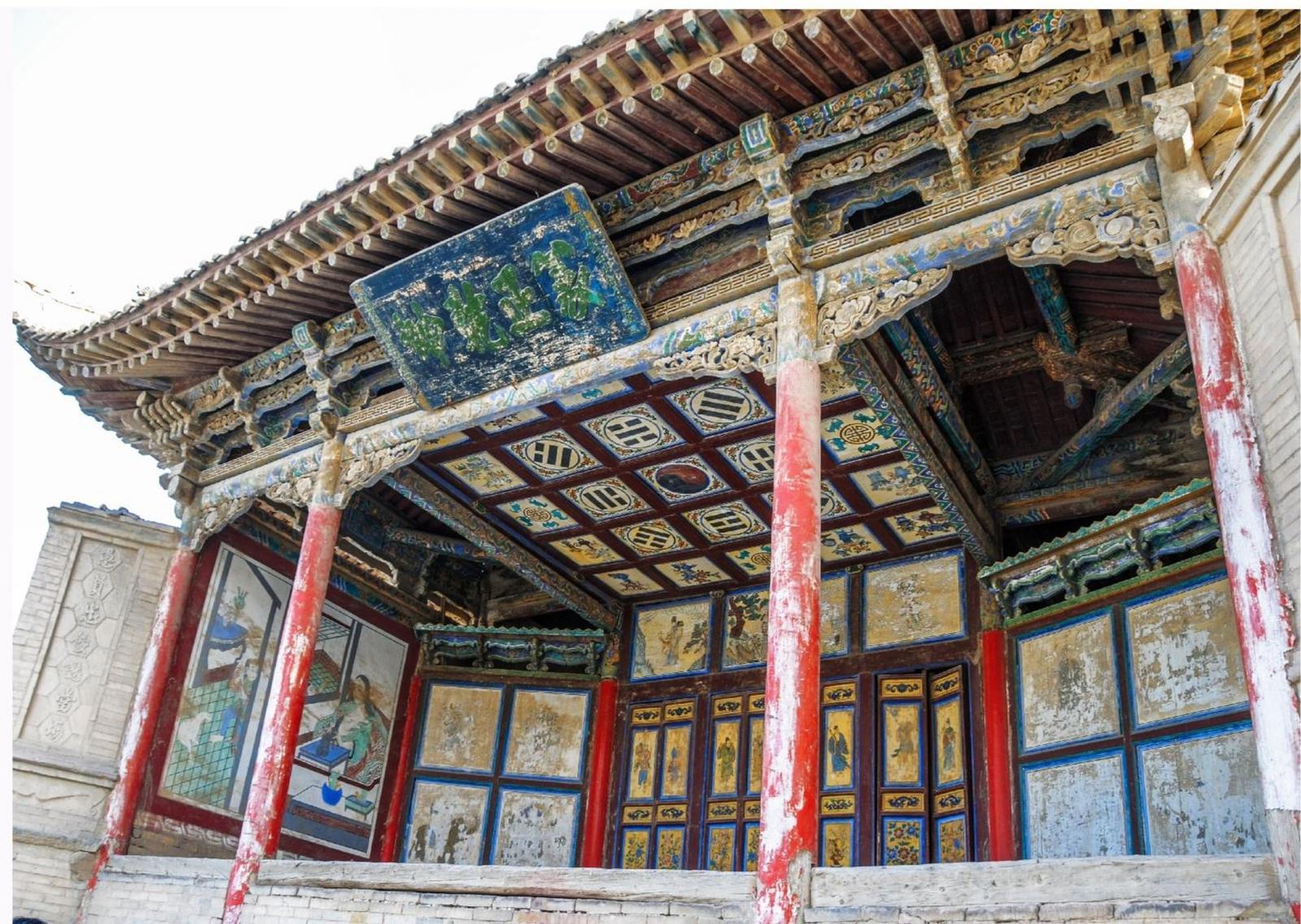 關(guān)帝廟戲樓(現(xiàn)存),關(guān)帝廟又稱武安王廟。明朝中期修建,萬(wàn)歷六年(公元1578年)奉命鎮(zhèn)守嘉峪關(guān)的酒泉人佘動(dòng)帶頭重修。乾隆五十七年(公元1792年),游擊將軍袋什衣主持重修,關(guān)帝廟戲樓是當(dāng)時(shí)守城官兵、城內(nèi)居民及過(guò)往商旅的娛樂(lè)場(chǎng)所。戲樓位于朝宗門斜對(duì)面,南閘門內(nèi)側(cè),關(guān)帝廟對(duì)面。它的形制是典型的中國(guó)傳統(tǒng)古典戲臺(tái)。關(guān)帝廟戲臺(tái)上就有一副意義深遠(yuǎn)的對(duì)聯(lián),在兩側(cè)的八字屏風(fēng)磚上刻有:“離合悲歡演往事,愚賢忠佞認(rèn)當(dāng)場(chǎng)。”