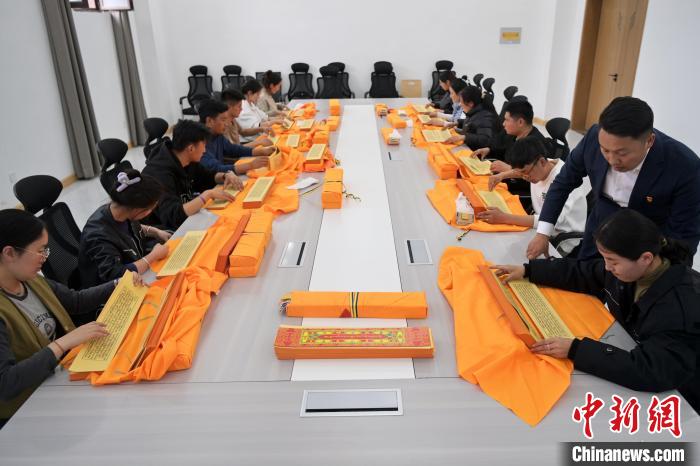2月27日,在甘肅甘南藏族自治州碌曲縣益西達(dá)吉科技有限公司內(nèi),工作人員正在進(jìn)行藏文古籍?dāng)?shù)字化相關(guān)工作。該公司主要從事民族古籍?dāng)?shù)字化建設(shè)和古籍文獻(xiàn)數(shù)據(jù)庫(kù)建設(shè),自2019年以來(lái),承擔(dān)西藏、四川、甘肅等省區(qū)的藏文古籍?dāng)?shù)字化項(xiàng)目。圖為工作人員對(duì)藏文古籍(木刻版)做數(shù)字化工作前期準(zhǔn)備。中新社記者 九美旦增 攝