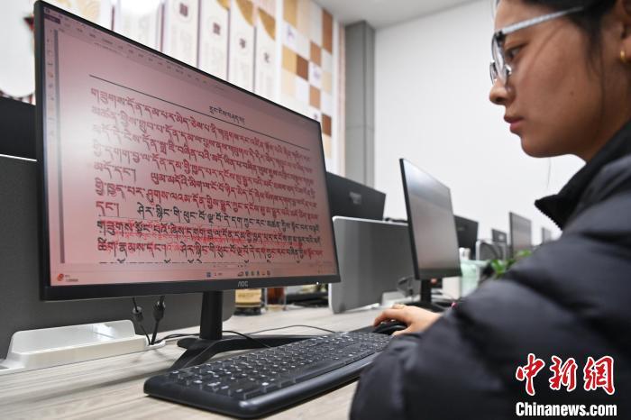 2月27日,在甘肅甘南藏族自治州碌曲縣益西達(dá)吉科技有限公司內(nèi),工作人員正在進(jìn)行藏文古籍?dāng)?shù)字化相關(guān)工作。該公司主要從事民族古籍?dāng)?shù)字化建設(shè)和古籍文獻(xiàn)數(shù)據(jù)庫(kù)建設(shè),自2019年以來(lái),承擔(dān)西藏、四川、甘肅等省區(qū)的藏文古籍?dāng)?shù)字化項(xiàng)目。圖為工作人員對(duì)藏文古籍?dāng)?shù)字化內(nèi)容進(jìn)行校對(duì)。中新社記者 九美旦增 攝