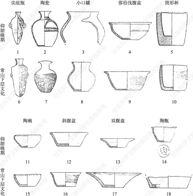 在文化傳承方面,以往認為甘肅東部地區(qū)原始文化發(fā)展序列是從仰韶文化經(jīng)馬家窯文化(含石嶺下、馬家窯、半山和馬廠四個類型)再到齊家文化,且常山下層文化源于馬家窯文化馬家窯類型。近年郎樹德先生提出新序列是老官臺文化(大地灣遺址一期)→仰韶文化早期(半坡類型、大地灣遺址二期)→仰韶文化中期(廟底溝類型、大地灣遺址三期)→仰韶文化晚期(大地灣遺址四期)→常山下層文化(大地灣遺址五期)→齊家文化,認為常山下層文化源頭是仰韶文化而不是馬家窯文化,且是齊家文化的重要源頭之一,糾正了齊家文化是馬家窯文化馬廠期發(fā)展來的不嚴謹說法,還認為隴東地區(qū)沒有齊家文化的遺存,類似齊家的器物其實就是常山下層文化。還有學者認為寧夏南部的“齊家文化”(菜園文化)與典型齊家文化有差異,且與常山下層文化更接近,應歸屬于此。但學界普遍認為常山下層文化繼承仰韶文化之后,在向西擴展過程中,與當?shù)赝林幕嗷ソ蝗?,逐漸演變?yōu)楠毦咛厣牡胤椒种?。從考古發(fā)現(xiàn)來看,常山下層文化應屬龍山早期文化遺存,在發(fā)展進程中,與關(guān)中地區(qū)的案板三期文化相互交流,同時向東對客省莊二期文化的形成產(chǎn)生了一定影響。不可否認,齊家文化在形成過程中,受到客省莊二期文化和馬廠文化的深刻影響,呈現(xiàn)出多元融合的態(tài)勢。故而,1979年常山遺址的發(fā)掘及“常山下層文化”的命名,為探尋渭河流域仰韶文化的發(fā)展走向以及齊家文化的起源,開辟了全新路徑,為構(gòu)建甘肅東部地區(qū)新石器考古文化編年體系提供了關(guān)鍵依據(jù)。