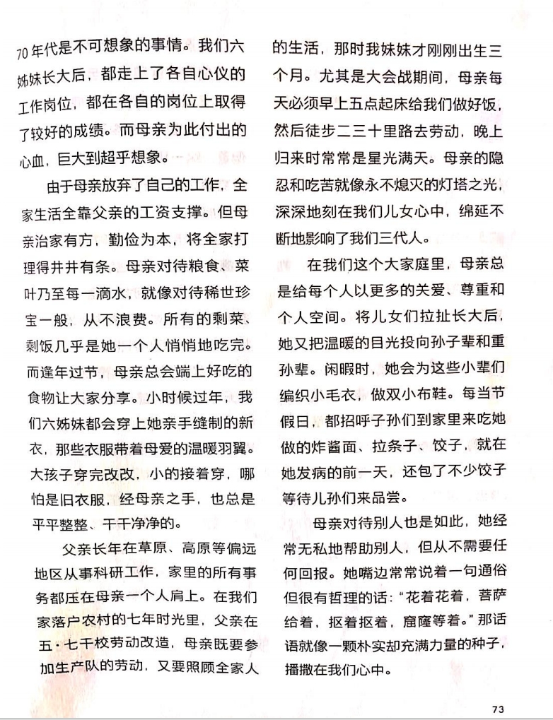 由于母親放棄了自己的工作,全家生活全靠父親的工資支撐。但母親治家有方,勤儉為本,將全家打理得井井有條。母親對待糧食、菜葉乃至每一滴水,就像對待稀世珍寶一般,從不浪費(fèi)。所有的剩菜、剩飯幾乎是她一個人悄悄地吃完。而逢年過節(jié),母親總會端上好吃的食物讓大家分享。小時(shí)候過年,我們六姊妹都會穿上她親手縫制的新衣,那些衣服帶著母愛的溫暖羽翼。大孩子穿完改改,小的接著穿,哪怕是舊衣服,經(jīng)母親之手,也總是平平整整、干干凈凈的。