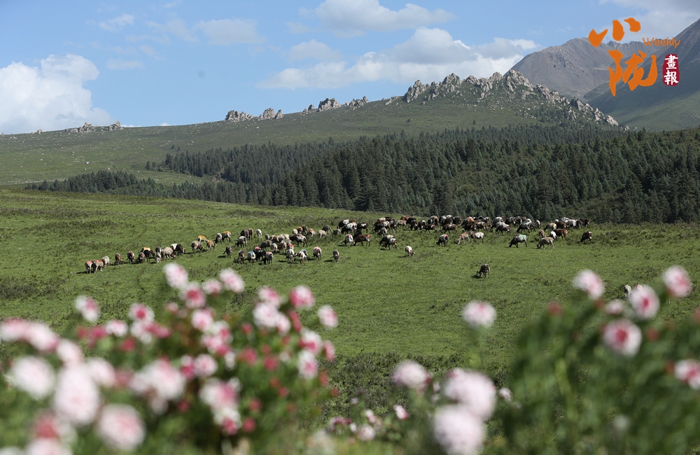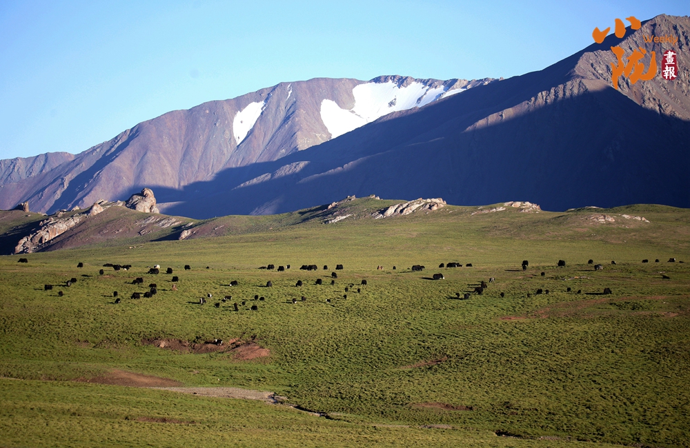 初夏時(shí)節(jié),祁連山國(guó)家公園張掖肅南縣境內(nèi),天空湛藍(lán)如洗,草原碧綠廣闊,巍峨的雪山仿佛插入云端,牛羊在青草中覓食,勾勒出一幅天然秀麗的生態(tài)畫(huà)卷。