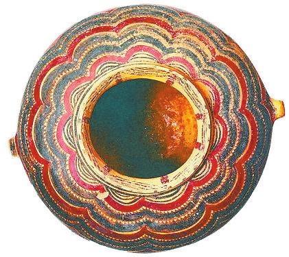 其中以馬家窯文化彩陶為代表,蘊含著眾多神秘的社會文化信息,以線條作為造型手段、以黑色(墨色)作為主要基調,奠定了中國畫發(fā)展的歷史基礎與以線描為特征的基本形式。馬家窯文化彩陶也是中國音樂舞蹈的開端呈現(xiàn)。1973年,甘青地區(qū)大通縣出土的馬家窯文化彩陶舞蹈紋盆,內壁繪舞蹈人物3組,每組5人,令人感受到遠古舞蹈強烈的節(jié)奏感。1991年,甘肅武威市發(fā)現(xiàn)的彩陶舞蹈紋盆,內壁繪有兩組手拉手的舞蹈人物,每組9人,舞蹈人數(shù)更多。1995年,宗日遺址再次出土一件馬家窯文化彩繪舞蹈紋盆,內壁所繪舞蹈人物兩組,分別為11人和13人,給人一種優(yōu)雅的舞蹈意境。1986年,甘肅省永登縣出土馬家窯文化的彩陶鼓。這些珍貴的彩陶器物成為研究中國原始歌舞和音樂起源的佐證。