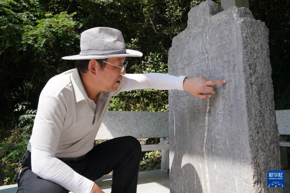 7月14日,在青泥嶺上,徽縣博物館文博副研究館員曹鵬雁在介紹一塊刻有“遠(yuǎn)通吳楚”字樣的清代石碑。新華社記者 馬寧 攝