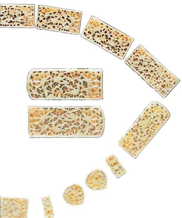 排方長5.1厘—7.6厘米、寬3.3厘米、厚0.7厘米,1955年蘭州市上西園明墓出土。青灰色和田玉鏤雕而成,包括三臺1、弼輔4、圓桃4、鉈尾2、排方7,均透雕牡丹花枝,邊緣有界欄。其中四塊較大的長條排方,雕飾最為精美,于繁花密葉間配置一對雉雞,構圖繁縟,富于變化,顯示出工匠高超的技術造詣。