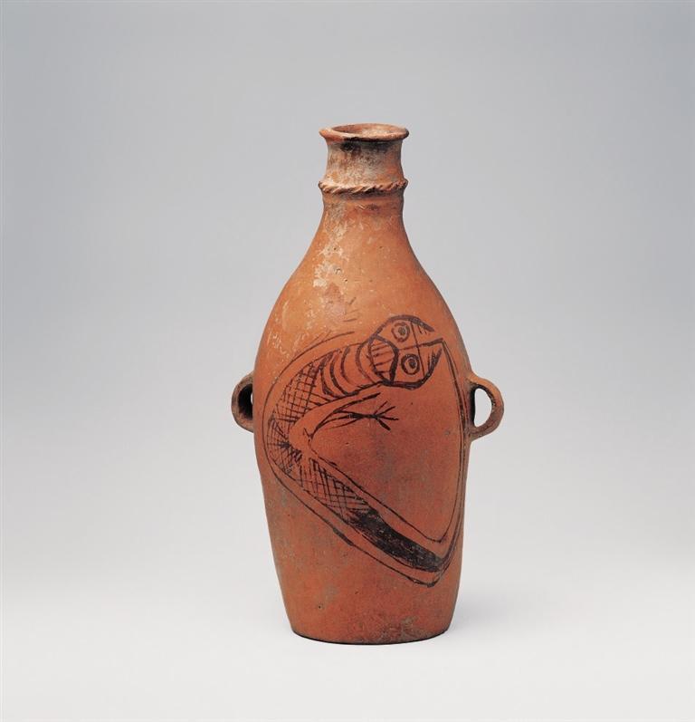 仰韶文化石嶺下類型(距今5200年前)甘谷縣西坪出土高38.4厘米,口徑7厘米,底徑12厘米。小口、長(zhǎng)頸、平底、腹上部有雙耳,頸部有堆紋一圈。瓶腹繪黑色人首形的鯢魚圖樣,一雙短臂向外伸出,全身為斜格紋,尾部彎曲。