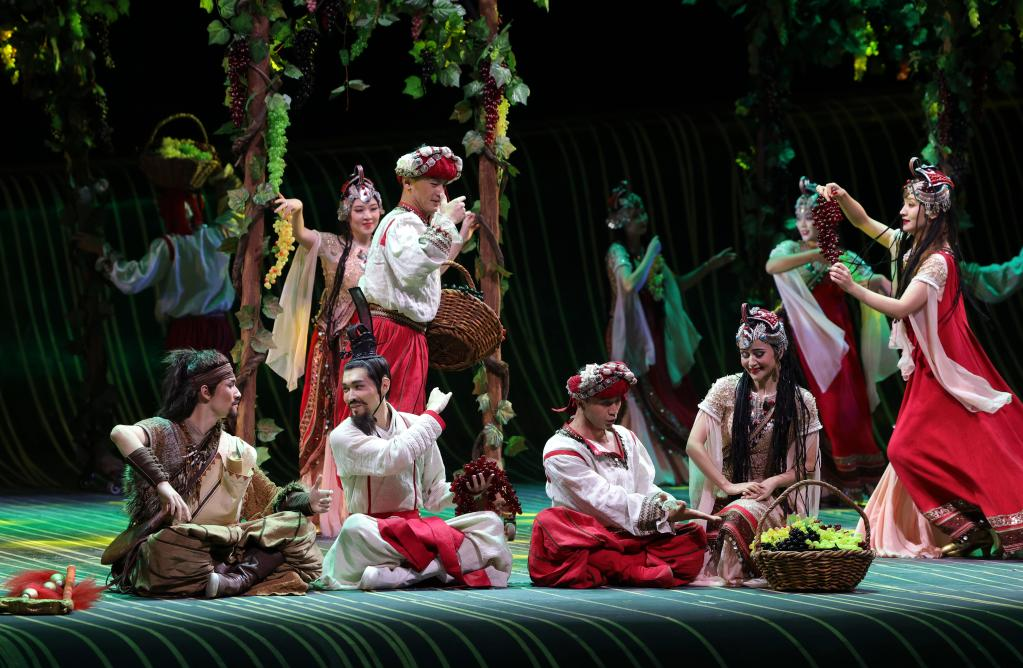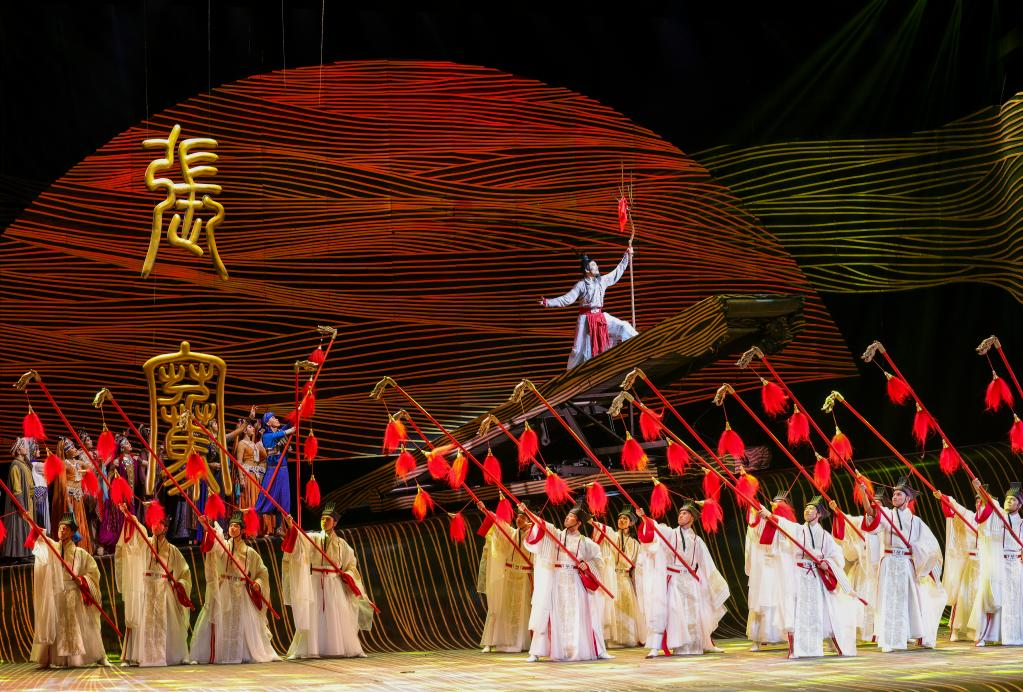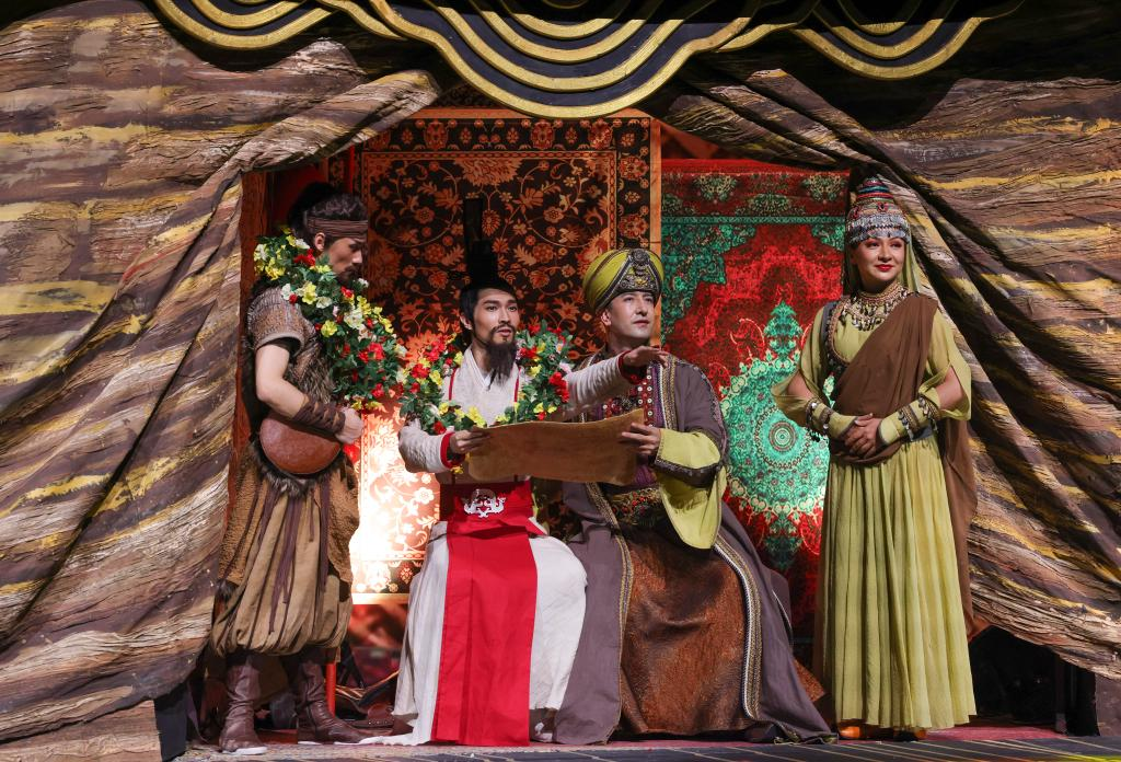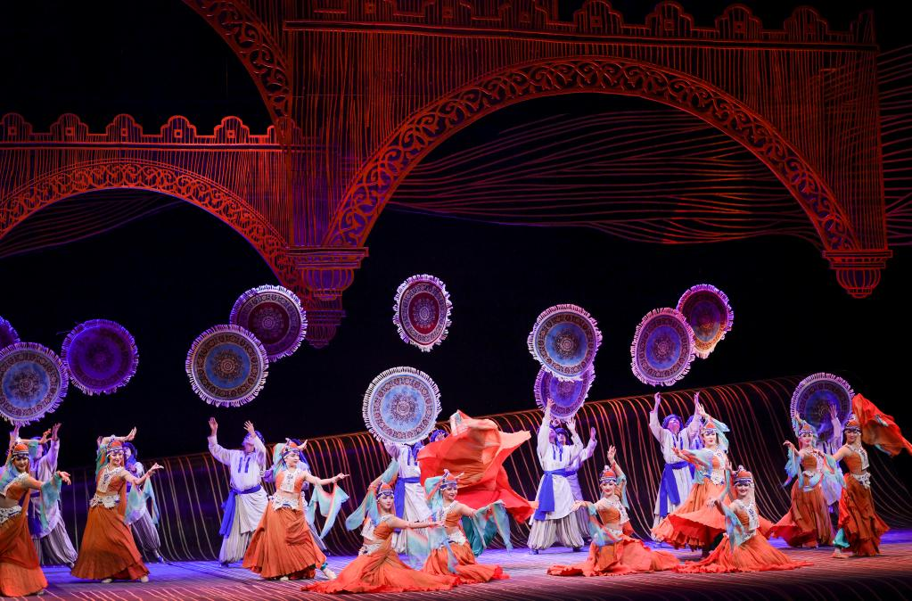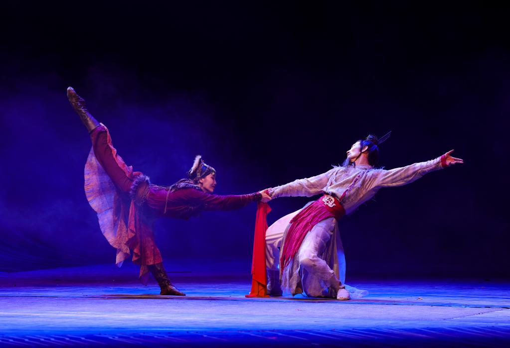 10月27日晚,在烏魯木齊文化中心大劇院,演員在舞劇《張騫》中表演。 10月27日晚,以漢代張騫出使西域?yàn)樗{(lán)本創(chuàng)作的重大歷史題材舞劇《張騫》,在烏魯木齊文化中心大劇院首演。該劇由《授節(jié)》《守節(jié)》《傳節(jié)》《使節(jié)》四幕組成,演繹了張騫出使西域的“鑿空之旅”,展現(xiàn)了各民族廣泛交往、全面交流、深度交融的生動場景。 新華社記者 王菲 攝