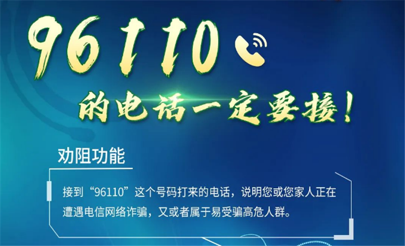 公安機(jī)關(guān)提醒:96110是官方預(yù)警勸阻專線,如接到“96110”號(hào)碼來(lái)電,說(shuō)明機(jī)主本人或其家人正遭遇電信網(wǎng)絡(luò)詐騙,請(qǐng)一定及時(shí)接聽并耐心聽取民警的勸阻提示,避免上當(dāng)受騙。