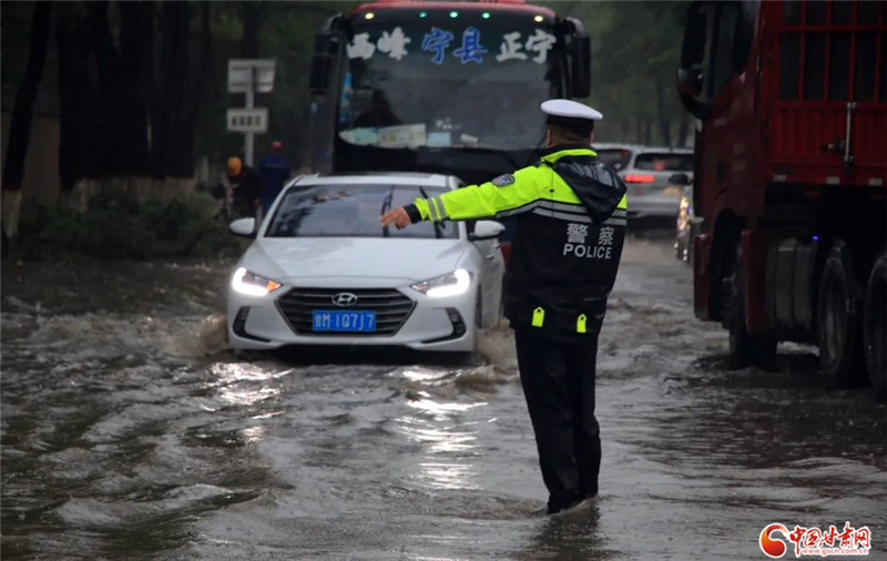 7月15日18時,鎮(zhèn)原縣鎮(zhèn)北公路中盛公司路段積水深達80公分,一輛轎車熄火被困,車門無法打開,車內(nèi)一名癲癇患者病情發(fā)作,鎮(zhèn)原縣巡邏民警及時發(fā)現(xiàn),成功救出車內(nèi)被困人員并送醫(yī),交警、治安民警聯(lián)合消防隊員迅速實施道路排水、恢復交通秩序。