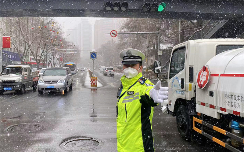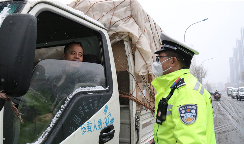 大隊(duì)領(lǐng)導(dǎo)實(shí)地查看道路通行情況,及時(shí)調(diào)整勤務(wù)模式和警力部署,確保降雪天氣各項(xiàng)安全“防控”措施落實(shí)到位。民輔警全員上路,強(qiáng)化重點(diǎn)路段巡邏管控和主要路口值守,對(duì)不具備通行條件車(chē)輛進(jìn)行勸返或提示繞行。通過(guò)鳴笛、喊話(huà)、閃爍警燈等措施,提醒駕駛員裝配防滑鏈,減緩車(chē)速、保持安全車(chē)距、注意觀察路面通行情況,引導(dǎo)車(chē)輛和行人安全有序通行。