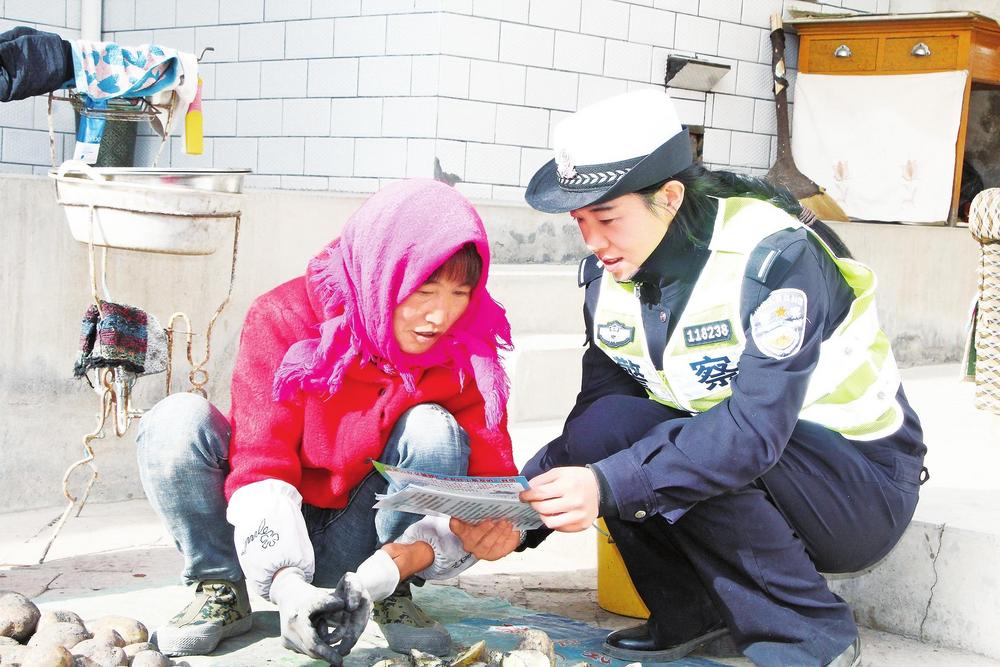 民警向群眾宣傳交通安全知識(shí)。3月10日,臨洮縣公安局交警大隊(duì)民警走村入戶,開(kāi)展交通安全宣傳活動(dòng)。新甘肅·甘肅法治報(bào)通訊員楊小娟攝