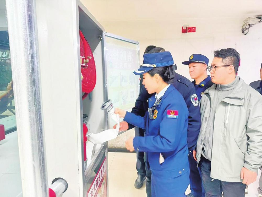 張文娟和同事檢查消防安全設施。城關區(qū)消防救援大隊供圖