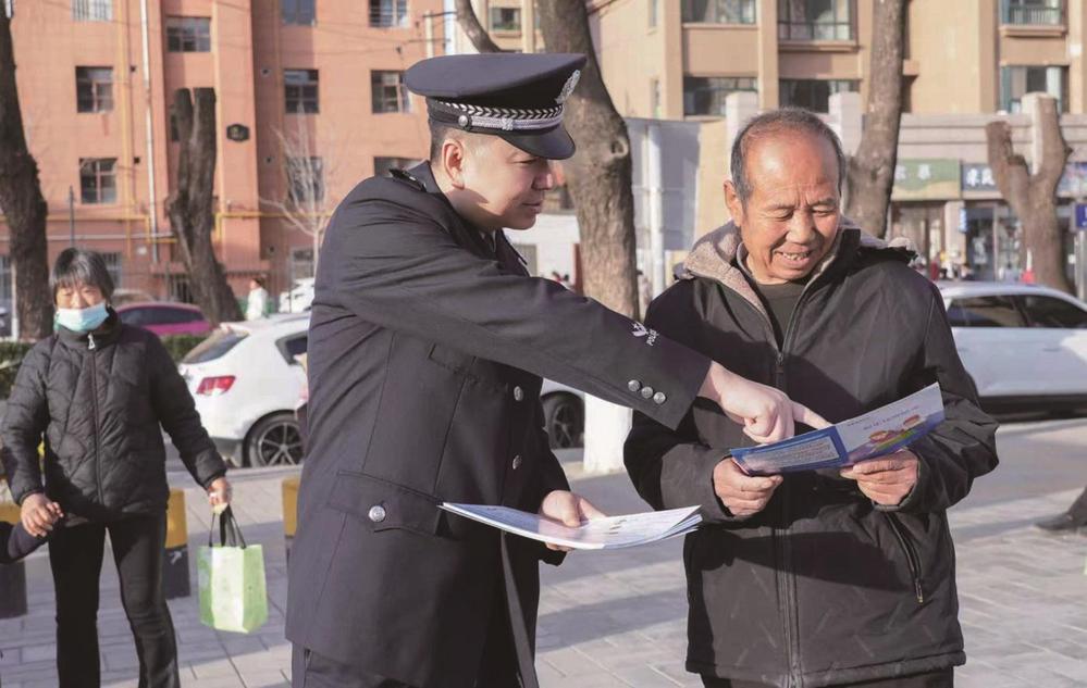 張峰天(中)向群眾宣傳反電詐知識。