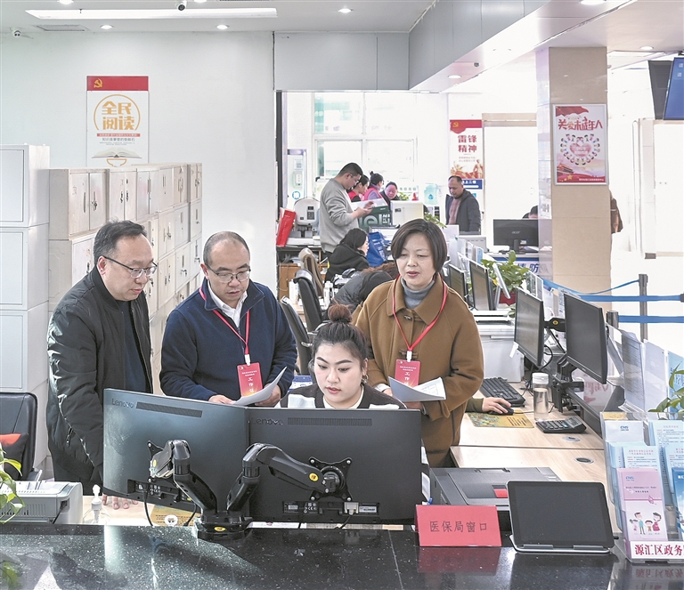 河南省漯河市源匯區(qū)紀(jì)委監(jiān)委聚焦醫(yī)?;鸢踩\(yùn)行等關(guān)鍵環(huán)節(jié)開(kāi)展專(zhuān)項(xiàng)整治,督促主管部門(mén)著力整治醫(yī)?;鸸芾碇刑搱?bào)冒領(lǐng)、騙取套取等違紀(jì)違法行為,嚴(yán)肅查處監(jiān)管失職失責(zé)及背后的不正之風(fēng)和腐敗問(wèn)題。圖為近日,該區(qū)紀(jì)委監(jiān)委工作人員到區(qū)行政服務(wù)中心醫(yī)保局窗口走訪(fǎng)核實(shí)相關(guān)情況。尤亞輝 攝