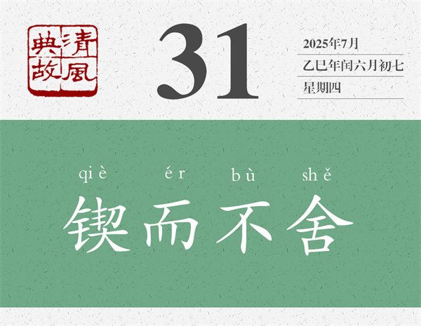 這段話中,為后人貢獻了好幾個典故,一個是“跬步千里”,一個是“鍥而不舍”。前者從“不積跬步,無以至千里”而來,不過只是反其意而用之,意思是,只要一步一步走下去,就能達到千里之遠(yuǎn)。后者是從“鍥而不舍,金石可鏤”而來,意思非常清楚:一直雕刻而不停止,即使一塊金石也能雕刻成器。后即以“鍥而不舍”比喻有恒心,有毅力。章炳麟《菌說》:“夫固謂一人鍥而不舍,則行美于本性矣。”