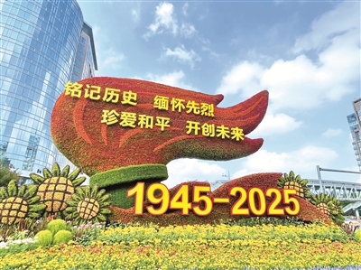 圖為紀念中國人民抗日戰(zhàn)爭暨世界反法西斯戰(zhàn)爭勝利80周年主題花壇。