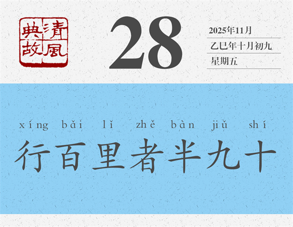 后人即以“行百里者半九十”為典,比喻做事情越到最后越困難,越接近成功越要認(rèn)真對待。黃庭堅雜言詩《贈元發(fā)弟放言》:“虧功一簣,未成丘山。鑿井九階,不次水澤。行百里者半九十,小狐汔(qì)濟濡其尾。故曰時乎,時不再來。終終始始,是謂君子。”全詩幾乎都在闡釋“行百里者半九十”。其中還用了《周易》中的一個比喻:小狐貍過河時,幾乎就要過去了,但因為拼命掙扎,還是弄濕了尾巴。