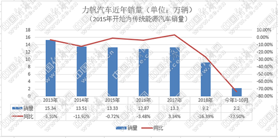 2006年,力帆推出首款轎車力帆520,新車不足5萬元的售價在當(dāng)時引發(fā)關(guān)注,月銷量一度達(dá)到5000輛。2013年,力帆年銷售汽車15.34萬輛,成為汽車界的一匹黑馬。然而,好景不長。自2016年開始,力帆汽車進(jìn)入下行趨勢,目前更是步履維艱。力帆產(chǎn)銷快報(bào)顯示,2019年1-10月,力帆傳統(tǒng)乘用車?yán)塾?jì)銷售2.2萬輛,同比下滑73.5%,10月僅銷售29輛;新能源累計(jì)銷售2458輛,同比下降65.42%,10月僅銷售423輛。