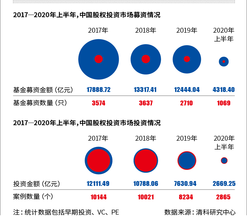 2020年上半年市場共有1069只基金完成新一輪募集,金額總計(jì)4318.40億元人民幣,同比下降29.5%;市場共發(fā)生2865起投資事件,涉及金額2669.25億元,同比分別下滑32.7%、21.5%。