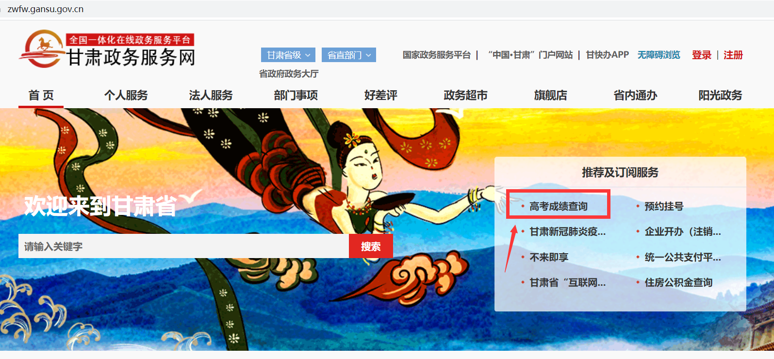 1.下載“甘快辦”APP,在首頁(yè)頂部點(diǎn)擊“高考成績(jī)查詢”;