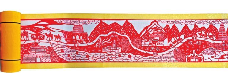 用剪紙藝術(shù)再現(xiàn)古絲綢之路的盛景,國家級(jí)非遺項(xiàng)目定西剪紙省級(jí)代表性傳承人付忠民經(jīng)過長(zhǎng)時(shí)間的構(gòu)思和調(diào)研,又歷經(jīng)5個(gè)月,終于創(chuàng)作出了長(zhǎng)達(dá)23.38米的剪紙長(zhǎng)卷——《古絲綢之路全圖》,再現(xiàn)了絲路古道的文化藝術(shù)魅力,該長(zhǎng)卷曾一舉創(chuàng)下世界紀(jì)錄協(xié)會(huì)“世界上最長(zhǎng)的剪紙長(zhǎng)卷”的世界紀(jì)錄。