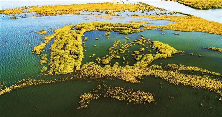 進(jìn)入10月,位于武威市民勤縣的亞洲最大沙漠水庫——紅崖山水庫群鳥歡鳴,湖水碧藍(lán)。水柳倒映之下,猶如一朵朵金黃的秋菊盛開。時(shí)值水鳥遷徙,大雁、白鷺、赤麻鴨、大天鵝等水鳥或在空中翱翔,或在湖中覓食,金黃金黃的胡楊樹葉閃爍鋪呈,一層又一層光暈,映照出一幅大漠水庫的金秋勝景。