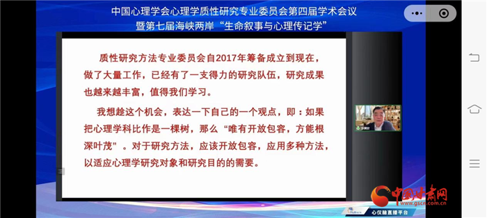 本次會議以“新征程中的中國質(zhì)性心理學(xué)”為主題,由中國心理學(xué)會心理學(xué)質(zhì)性研究專業(yè)委員會、西北師范大學(xué)共同主辦,西北師范大學(xué)心理學(xué)院和甘肅省心理學(xué)會承辦。來自美國、南非以及國內(nèi)北京師范大學(xué)、蘇州大學(xué)、華東師范大學(xué)、輔仁大學(xué)等高校和科研機(jī)構(gòu)的400余位學(xué)者,通過線上線下方式參加。