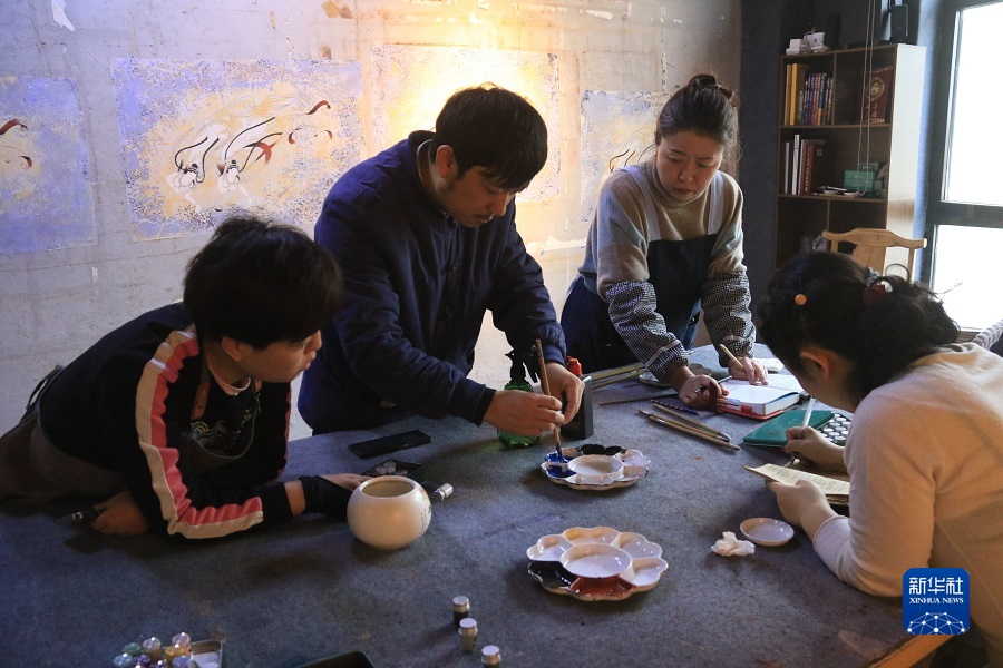2月22日,在敦煌小鎮(zhèn)鳴沙書院,藝術(shù)工作者張杰龍(中)指導(dǎo)學(xué)員進行顏料調(diào)色。