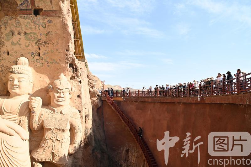 4月16日,甘肅省武威市涼州區(qū),學生在天梯山石窟參觀研學。